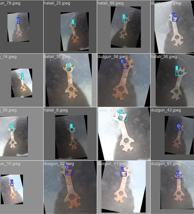 Sonuç görsellerinde, model hem düzgün hem de hatalı parçaları doğru şekilde işaretliyor.